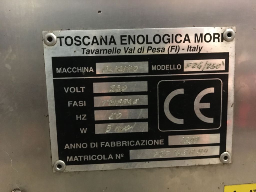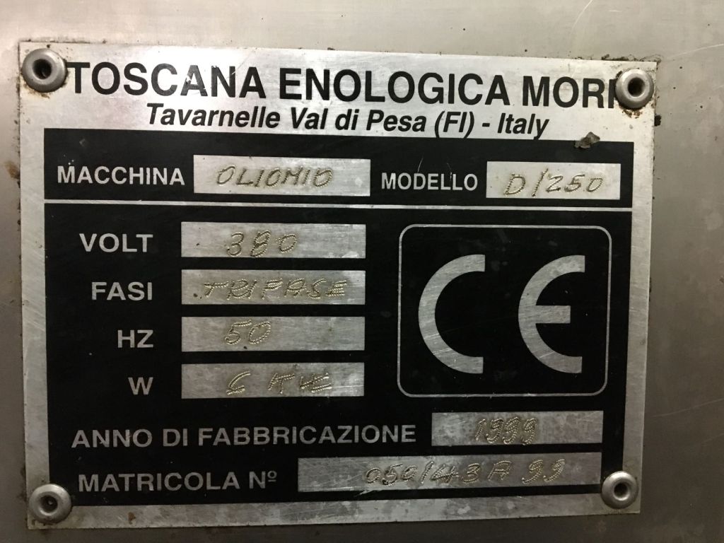 Existing Plant: Olio Mio, 1999 consisting of 3 modular units; DLE (Leaf Removal, Fruit Waster & Auger), F2G/250 (Crusher & 2 Malaxing Bowls with transfer), D/250 (Decanter unit with twin centrifuges).